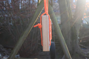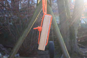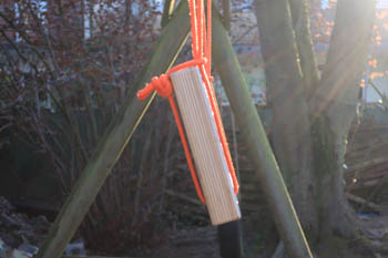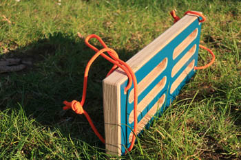 Zunächst wie auf Bild 1 zu sehen, jeweils 1m der Repschnur als Rundschlinge durch beide Löcher einer Seite durchziehen und mit einem Sackstich verknoten. Dabei sollte darauf geachtet werden, dass beide Knoten an der gleichen Position sitzen, damit nachher kein Höhenunterschied besteht.